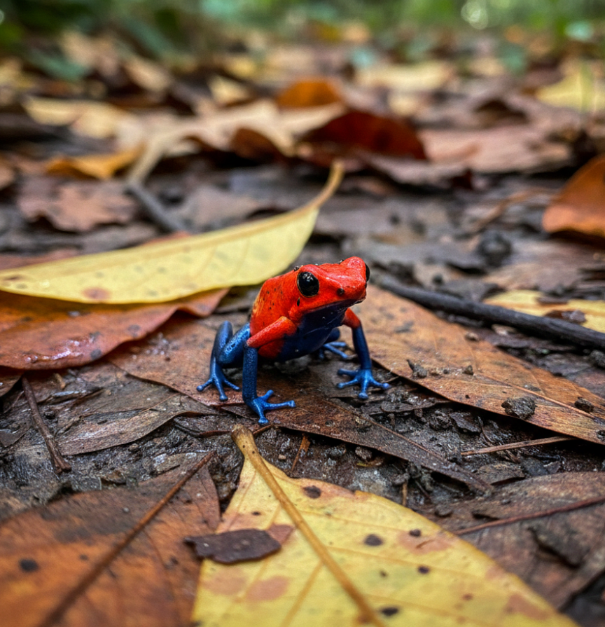 Abajo, sobre las hojas caídas y los sectores descubiertos del suelo húmedo, también llama la atención la pequeña Dendrobates, una rana saltarina color rojo brillante, de zancas azul oscuro.